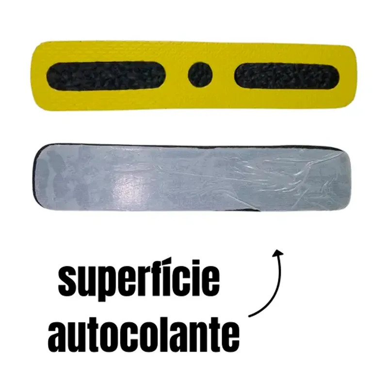 Seu design com detalhes em formato de círculos e faixas em preto sobre o fundo amarelo garante alta visibilidade e um toque moderno à sinalização. Pode ser facilmente instalado com cola de contato (não inclusa), sem a necessidade de furos.